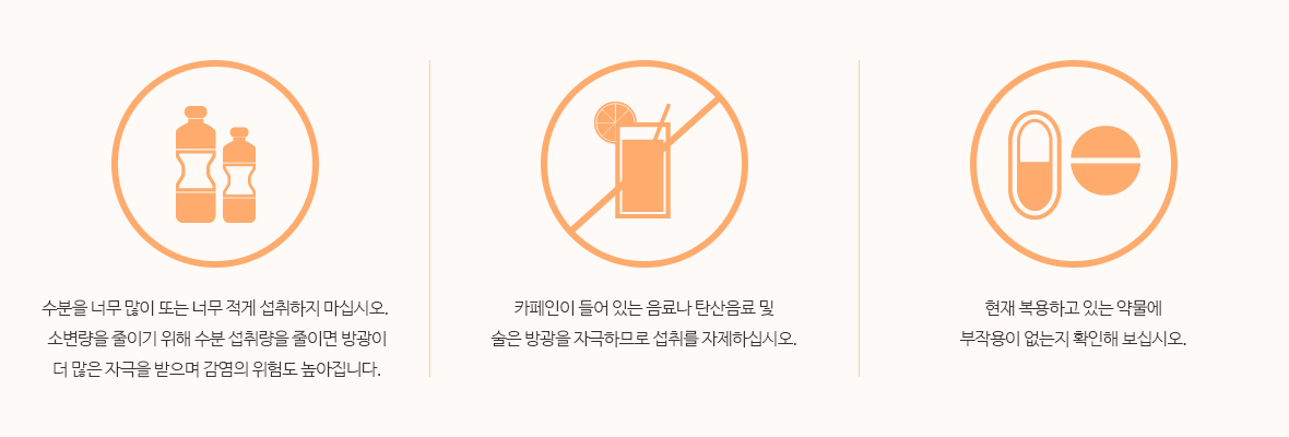 제외해야 합니다. 해당하는 경우는 소변 시간과 양 및 수분 섭취 양과 종류 등을 배뇨일지로 기록하도록 합니다.
